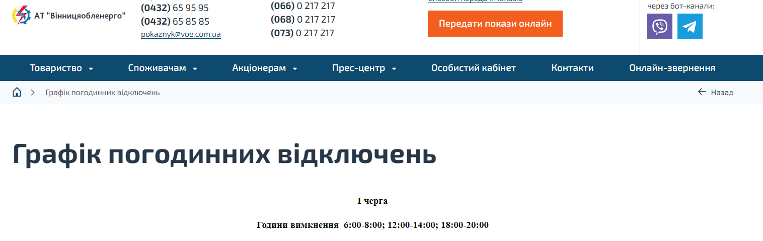 Години вимкнення 6:00-8:00; 12:00-14:00; 18:00-20:00