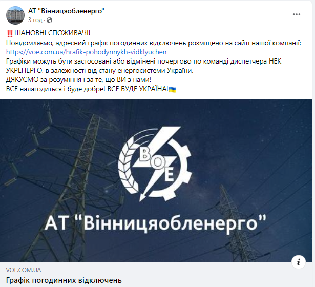 Разом з тим, станом на 14.20 на сайті «Вінницяобленерго» повідомлення про скасування погодинних графіків відключення електроенергії наразі не має.