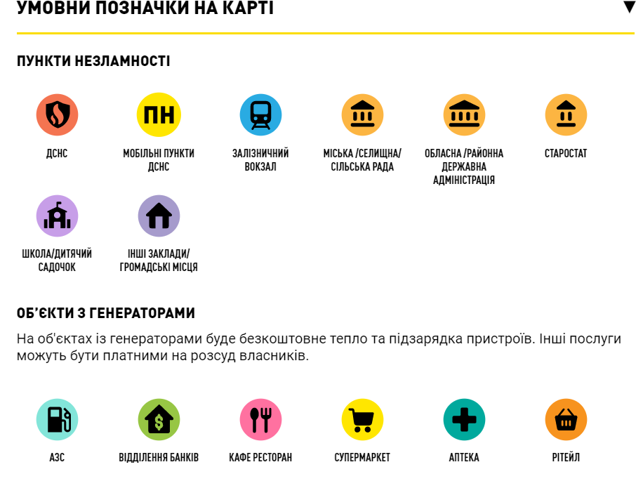 Пункти працюватимуть при всіх обласних та районних адміністраціях, також при школах, будівлях ДСНС тощо. На сайті та в усіх Пунктах Незламності можна буде дізнатись, де працює найближче АЗС, банківське відділення, аптека, магазин.