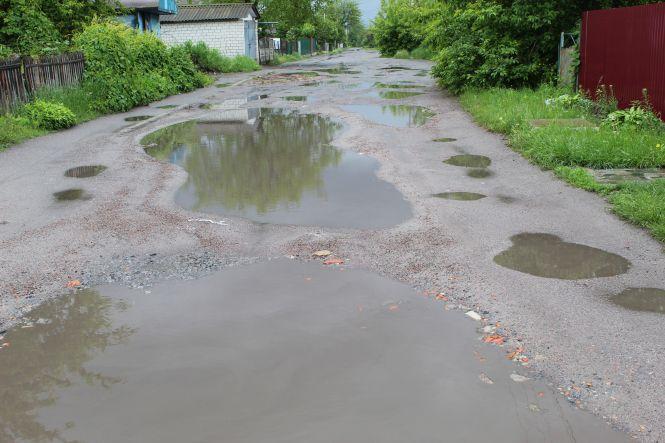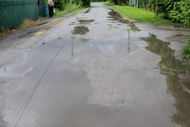 Калюжі, такі як на вулиці Грушевського, після дощів майже на всіх вулицях околиць міста.