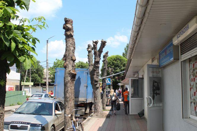 На вулиці Героїв Майдану біля будинку 42 видалили близько півтора десятка дерев. З іншої сторони вулиці Героїв Майдану зрізали каштан, який судячи з пенька, міг ще стояти не один рік. До аварійних дерев він не відносився і ніякої загрози для людей не ніс. Іноді дійсно, щоб росли кращі дерева, доводиться жертвувати деревами з неприглядною кроною, хворих з дуплами чи наростами на кроні. Але нам, наприклад, не зрозуміло, чому видалили горіха з нормальною кроною і залишили дерево, яке похилилося на тротуар. І є ж якийсь період для розчистки, а не у розпал літа.