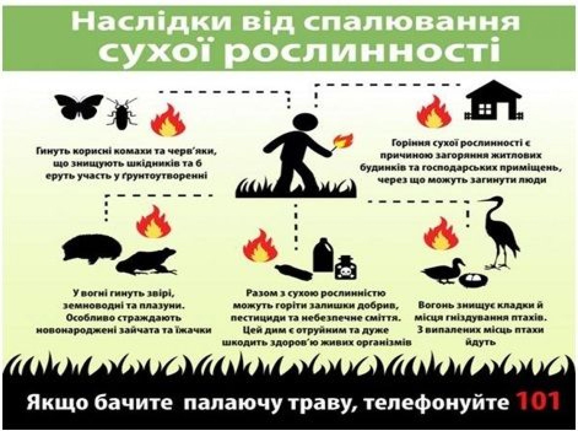 Єгері, мисливці, екологи та природозахисники нашого краю вже декілька днів б’ють тревогу щодо спалювання сухої трави. Екологи нагадують, що шкода від спалювання сухої трави різностороння і має негативні наслідки як для здоров’я людини, так і для природи. При згорянні однієї тонни рослинних залишків у повітря вивільняються близько 9 кг мікрочастинок диму. До їх складу входять пил оксиди азоту, чадний газ, який сильно впливає на людей з хронічними вадами дихання, важкі метали та низка канцерогенних сполук.