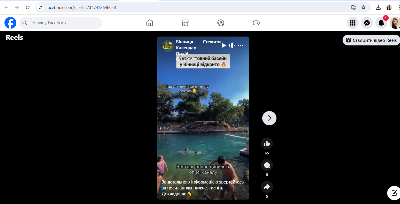 «Безкоштовний басейн у Вінниці відкрито. Ідеальне місце в теплу погоду», — такий гучний опис мав рілс, який нам трапився у стрічці новин. На відеоряді величезний басейн під відкритим небом на мальовничій території, оточеній крислатими деревами.