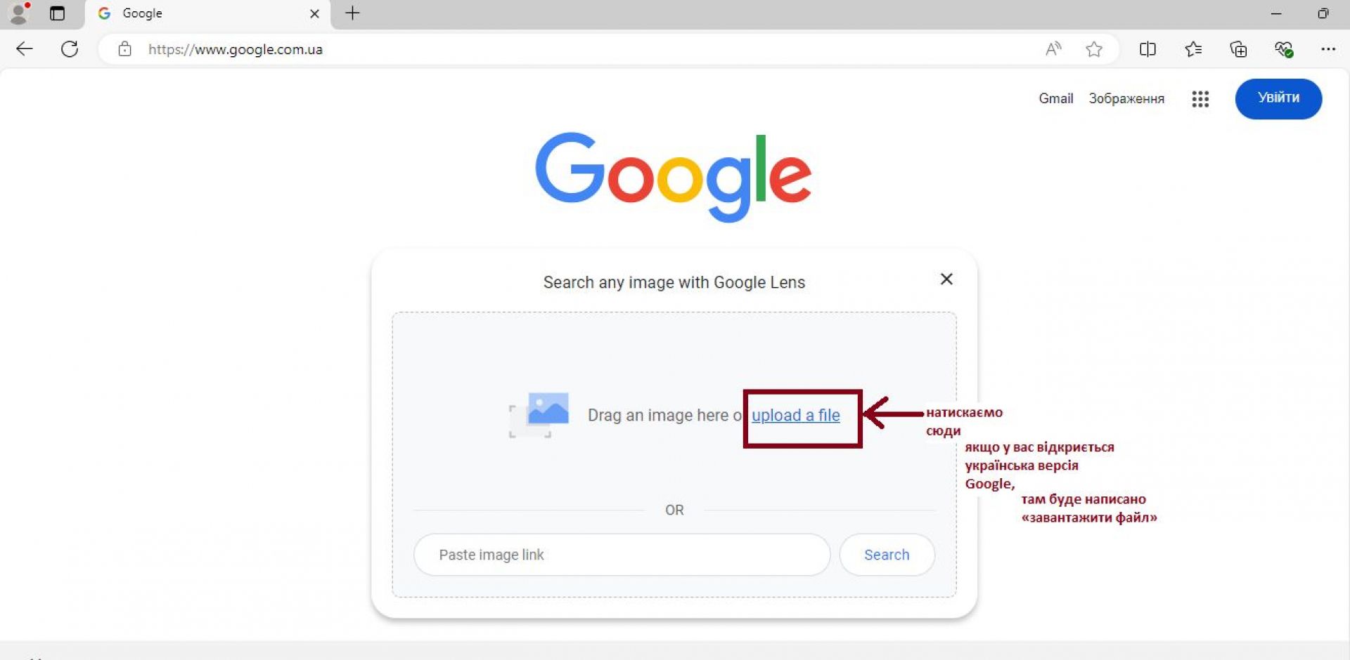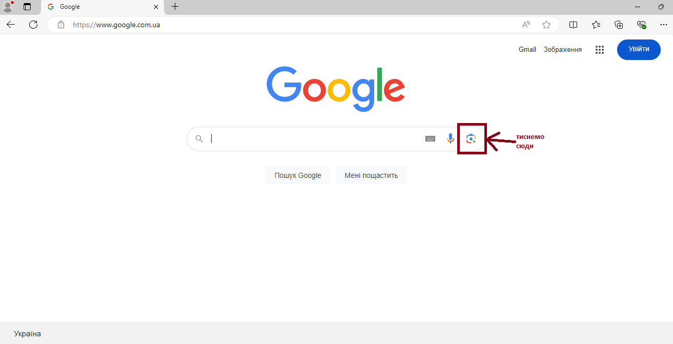 Відкриється сторінка пошукової системи, де буде рядок пошуку, і праворуч символи — мікрофон та фотокамера. Мікрофон допомагає здійснити голосовий пошук, фотокамера — пошук за фото. Натисніть на символ фотокамери.