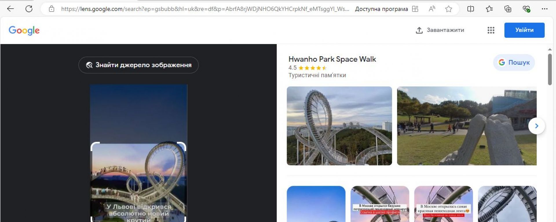 Виявилося, що мега крута локація, яку видавали і за київську, і за львівську, насправді розташована у Південній Кореї, у місті Пхохан. Оглядовий майданчик має назву «Space Walk» (космічна прогулянка — англ.). Його відкрили у 2021 році. Це одна з найпопулярніших туристичних родзинок Південної Кореї — до кінця 2023 року її відвідало близько двох мільйонів людей. Як ми дізналися справжнє місце розташування цього об’єкту? Все дуже просто — скористалися пошуковою системою «Google». Що саме ми зробили, щоб знайти інформацію — розкажемо трохи згодом.