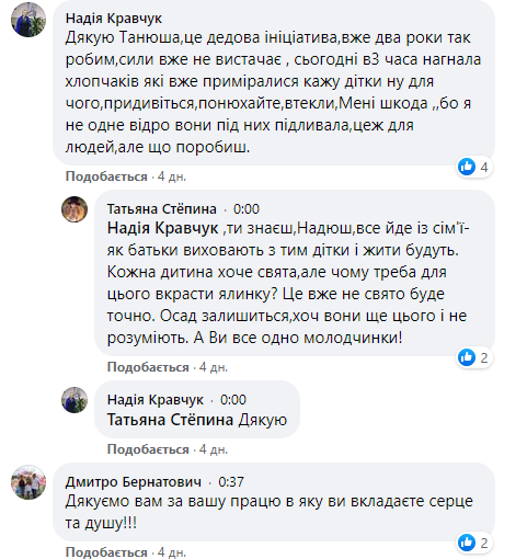 — Дорогі друзі, прошу вашого репосту. На зоні відпочинку Талимонівка ростуть чудові ялинки і перед кожним новим роком, живодери прагнуть зрізати не гребують навіть біля пам'ятника. Я хотіла їх проінформувати, що вони підкормлені фекаліями і оброблені вапном. Може прийдуть в ночі і не мають нюху.,то користі ніякої. Прошу будьте людьми не губіть зелених красунь, — пише Надія Кравчук у Фб