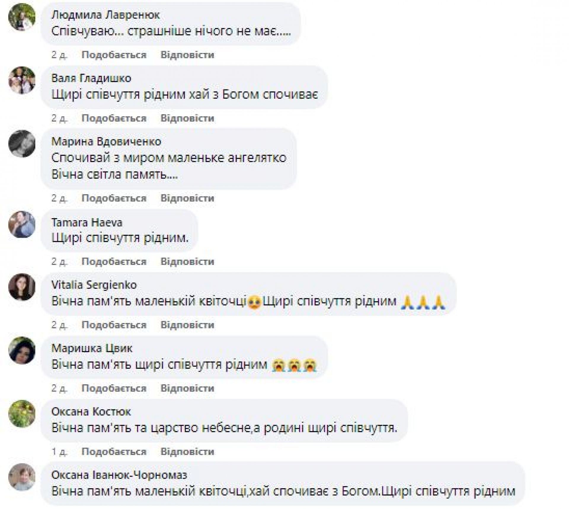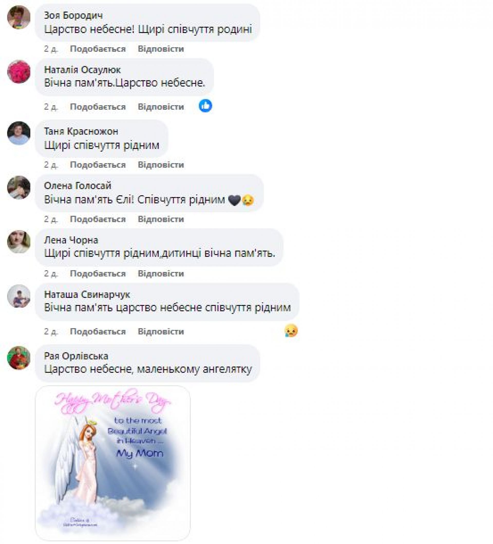 — Пішла з життя зовсім юна дівчинка... Важко знайти слова втіхи, неможливо загоїти біль та гіркоту від втрати, коли зупиняється серце рідної дитини… Нехай світла пам'ять про Еліну назавжди залишиться в серцях рідних та близьких, а Бог дасть Вам сил пережити цю непоправну втрату. — йдеться на сторінці навчального закладу