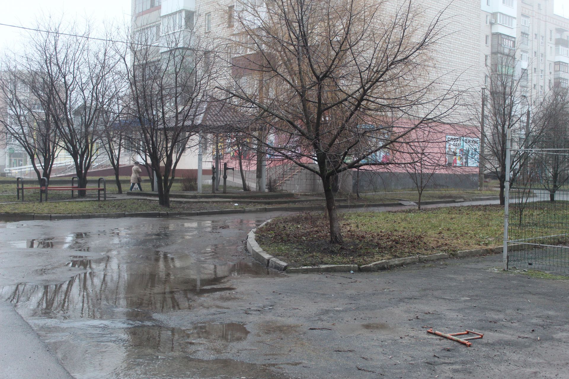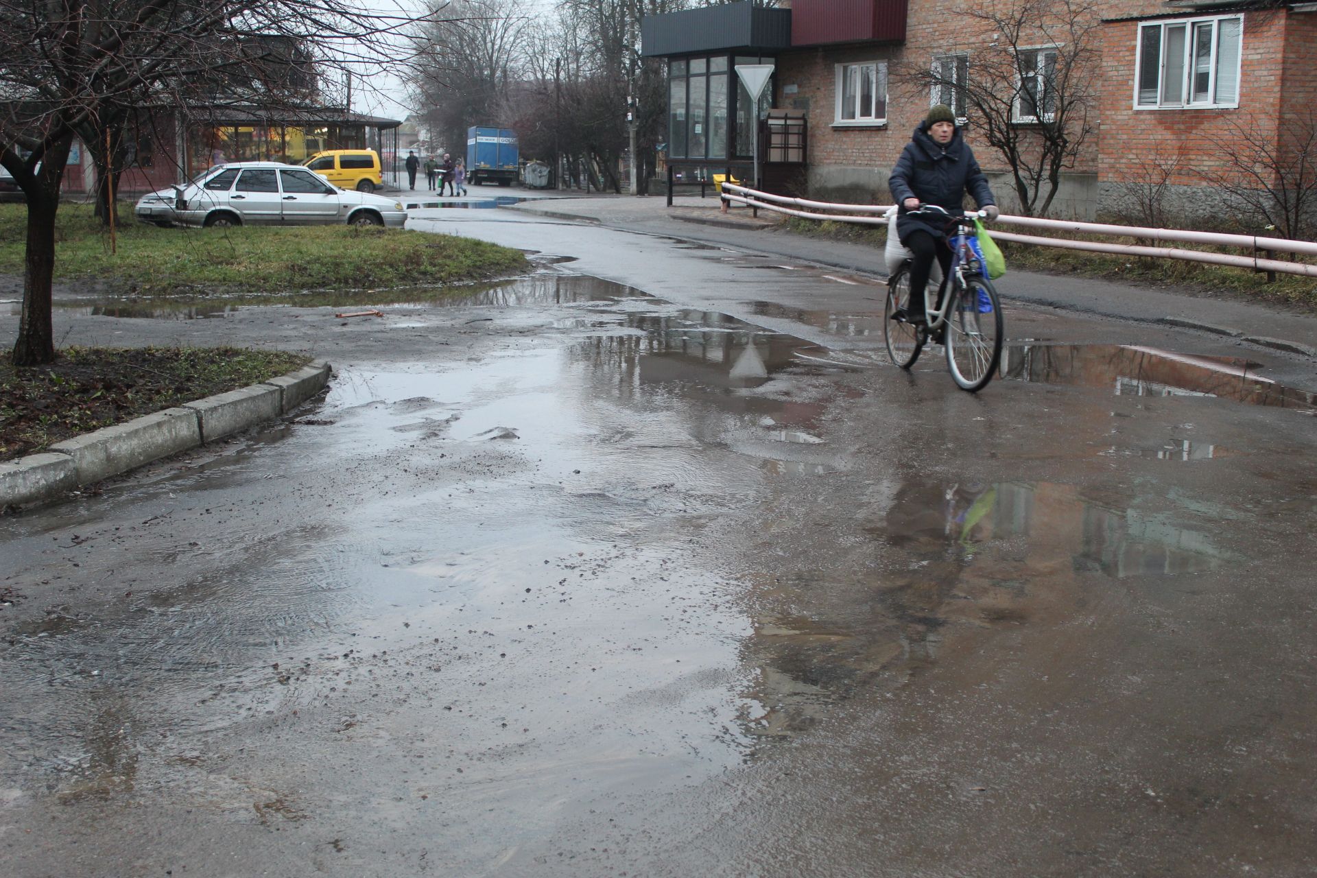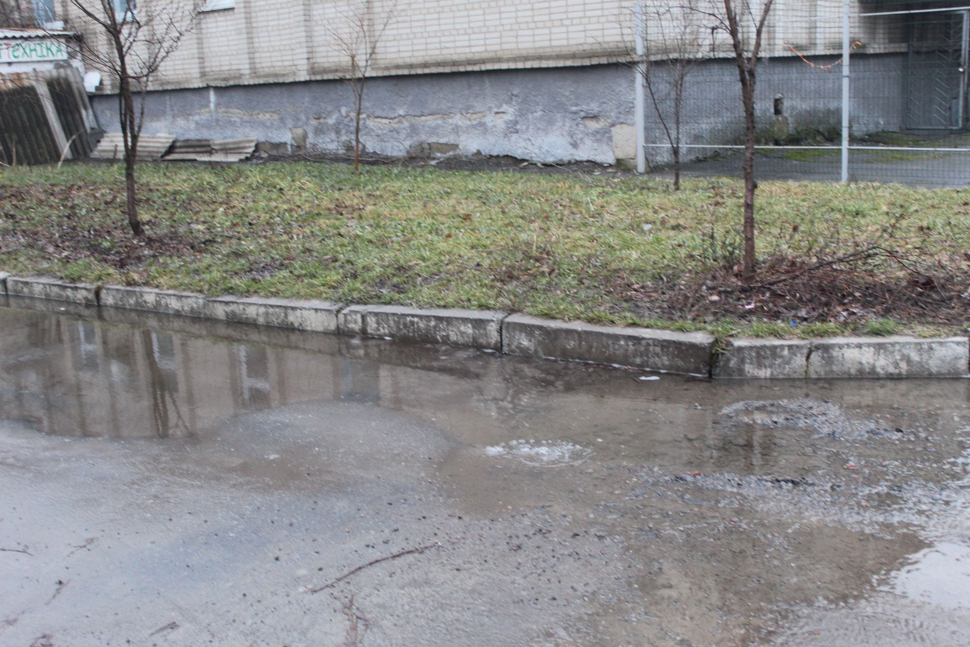 Недільного ранку ми їхали вулицею Пилипа Орлика по службових справах. На перехресті з вулицею Грушевського помітили струмочок змійкою. Пішли проти течії і прийшли на прибудинкову територію будинку 17 вулиці Героїв Майдану. Першою нашою співрозмовницею стала жителька дев’ятиповерхівки пані Наталія. За її словами про прорив труби водогону водяники знають, хтось же з них воду в будинку перекрив.