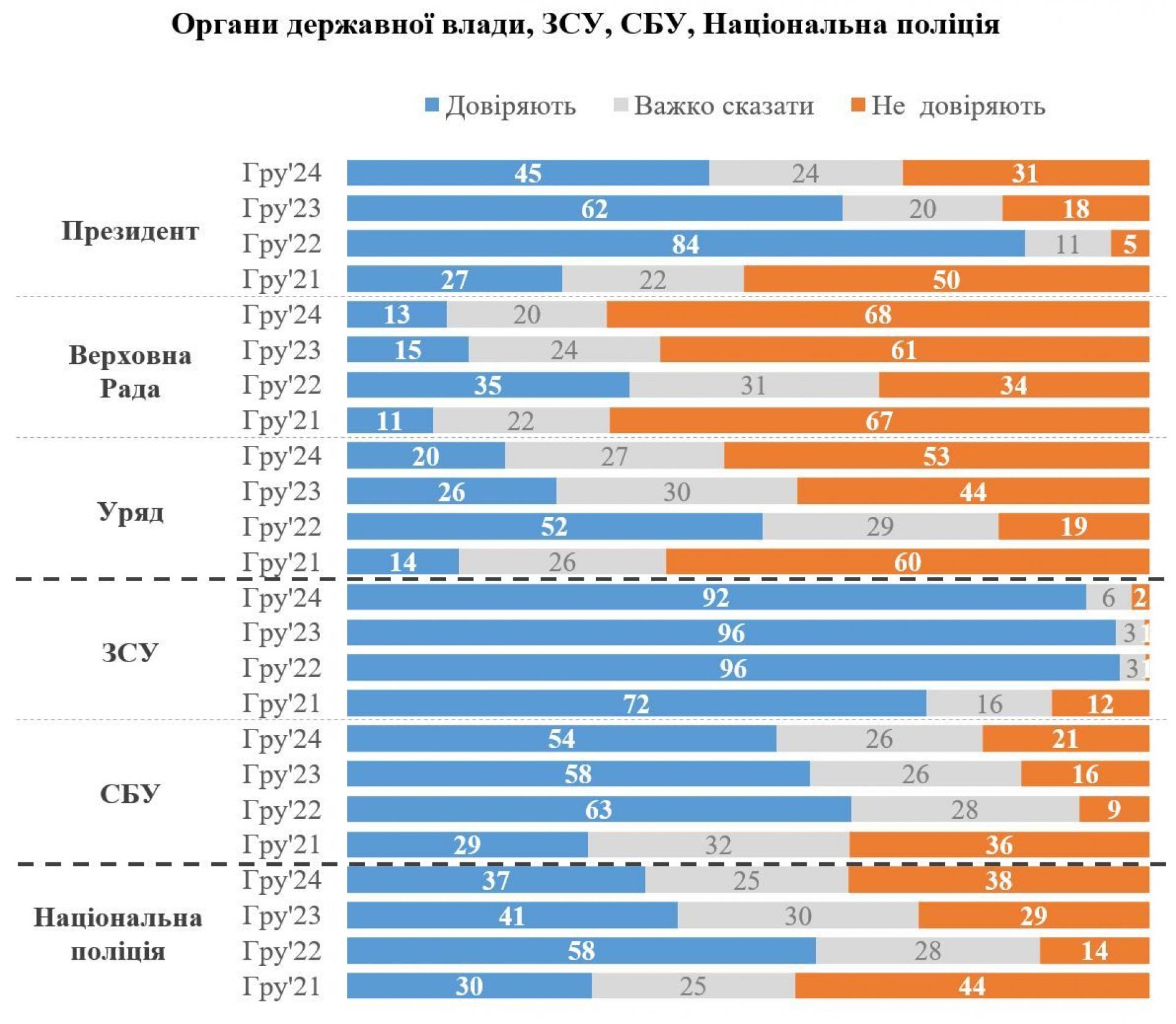 Київський міжнародний інститут соціології провів опитування, щоб дізнатися, як українці ставляться до різних державних органів, правоохоронних структур, церкви, ЗМІ та інших інституцій. Вони запитували людей, наскільки вони довіряють тим чи іншим організаціям, пропонуючи їм кілька варіантів відповідей: від «повністю довіряю» до «зовсім не довіряю».