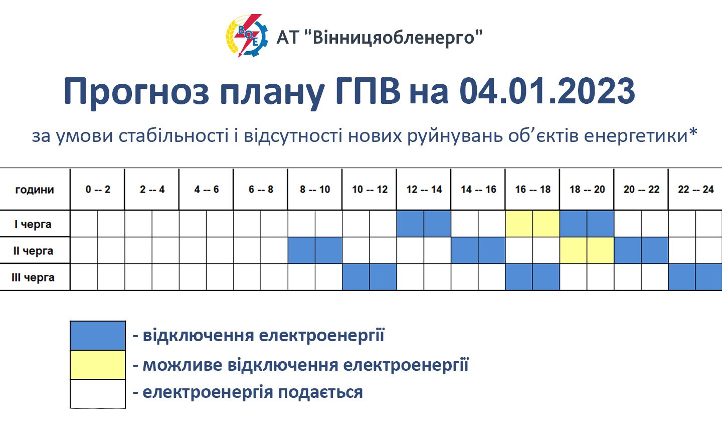 — Відповідно до доведеної граничної величини споживання електричної потужності на 04.01.23 р. по Вінницькій області задіяно обмеження електроспоживання відповідно до графіка погодинного відключення ГПВ, — йдеться на сайті Вінницяобленерго