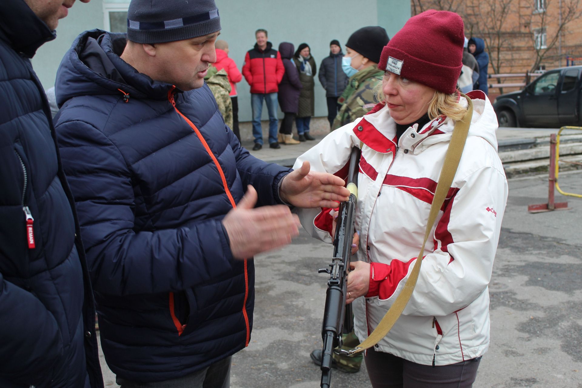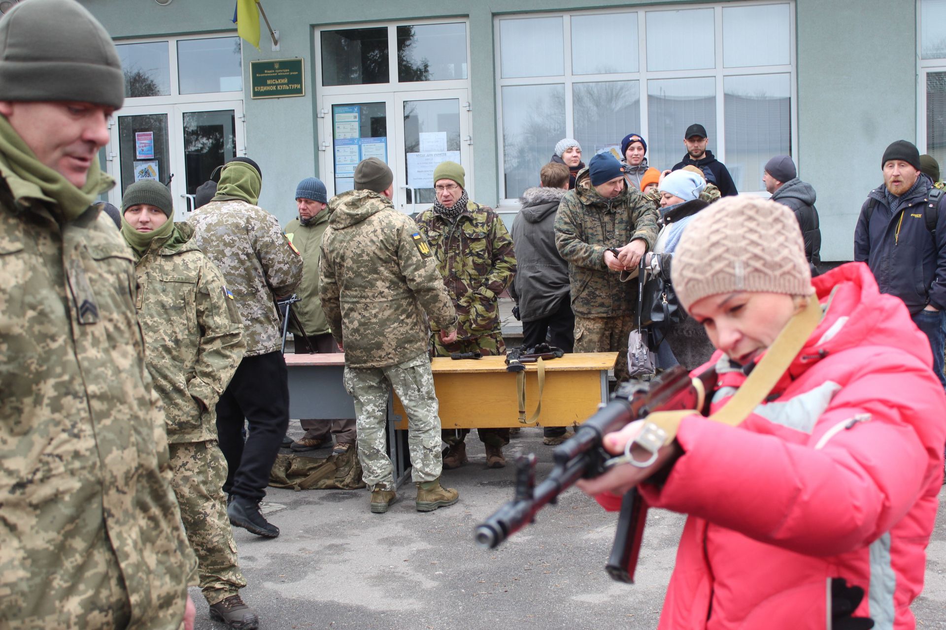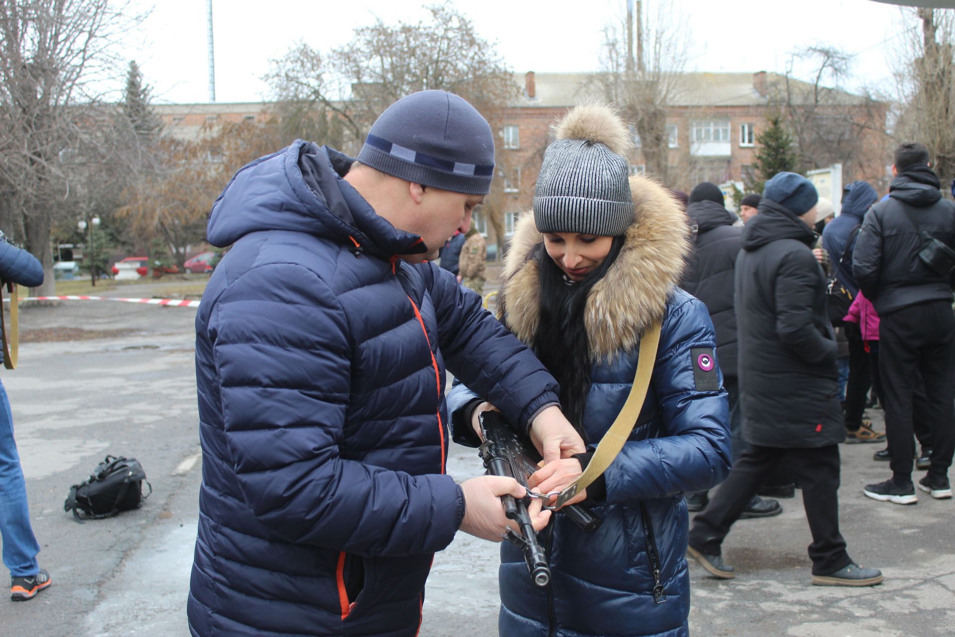 Тільки поступила команда зайняти позиції біля обраних локацій, як 2-і третини від присутніх на площі подалися до автоматичної зброї. Воно й не дивно, за неповну годину акції у члена територіальної оборони військового пенсіонера Майдановича до територіальної оборони записалося 20 осіб, з яких 4 жінки.