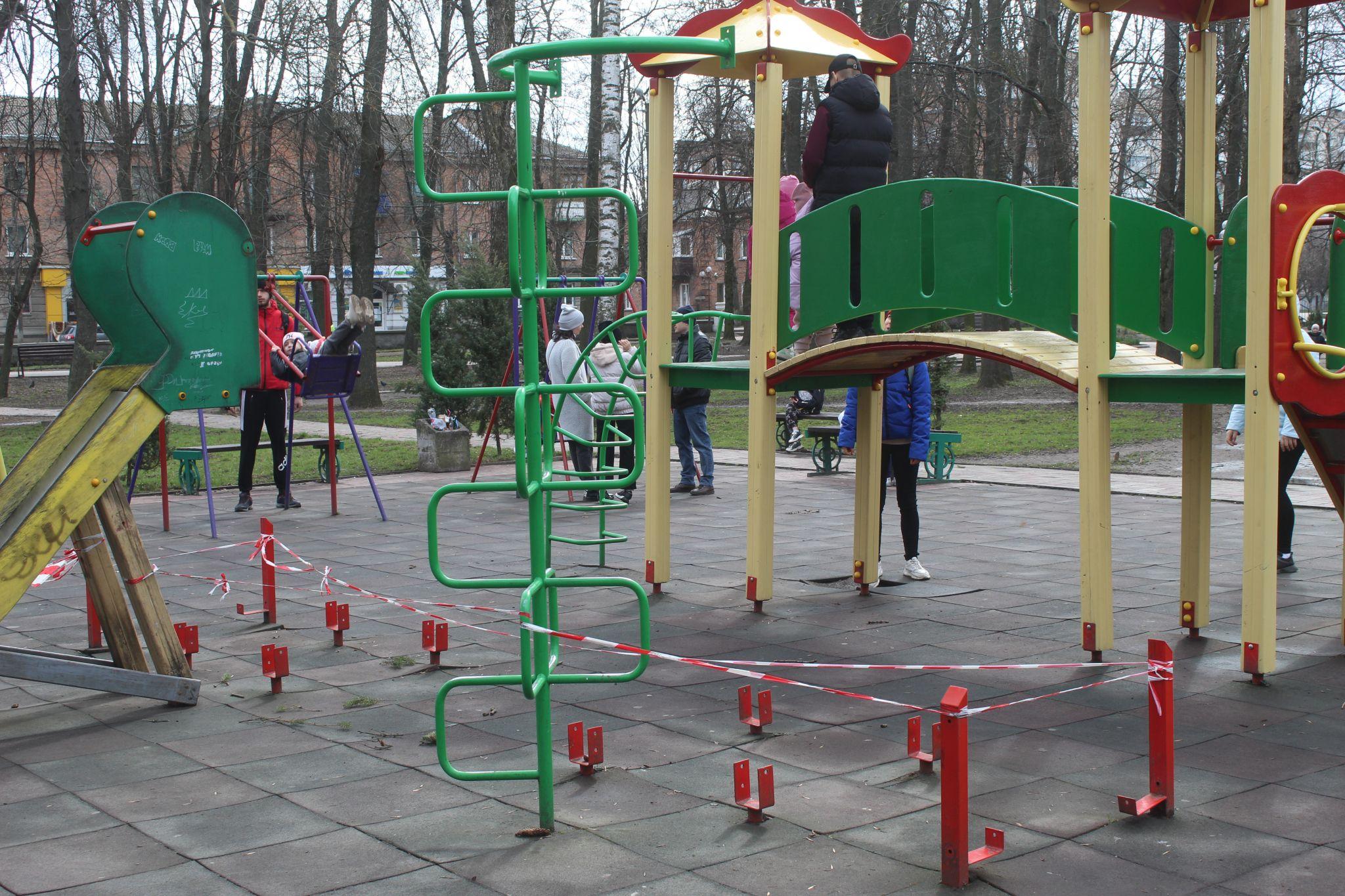 На дитячому майданчику у міському сквері ми поспілкувалися з мамами малечі. Запитали у них, чи безпечно зараз для їхніх дітей те, що штирі фіксації гірки загородили червоно-білою стрічкою.