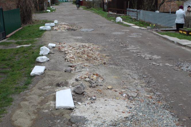 Почалася наша прогулянка містом з вулиці Грушевського. З тієї частини вулиці, де досі немає твердого покриття і ями на дорозі самотужки латають, чим можуть, мешканці вулиці. Від вулиці Шмідта до провулку Партизанського дорога в поганому стані вже років і років. Мабуть нею не особливо переймаються ще від тої пори, коли вулиця Грушевського називали Карла Лібкнехта.