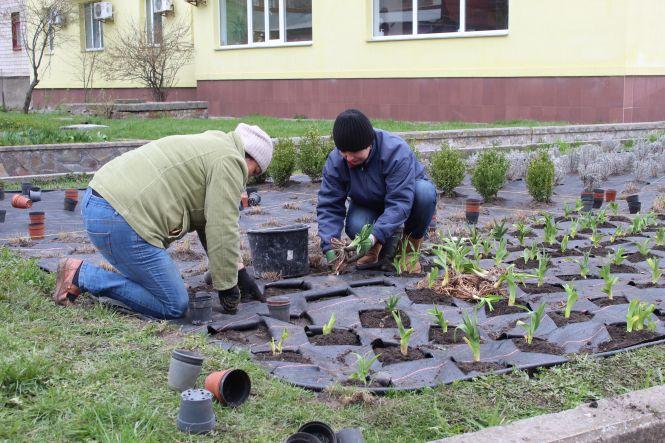 Біля колишнього районного будинку культури працівники міської ради висаджують квіти лілейник. Скільки вміститься на клумбі майбутніх суцвіттів невідомо, але за словами дівчат, які висаджували квіти в упаковках було по 140 екземплярів кожного сорту.
