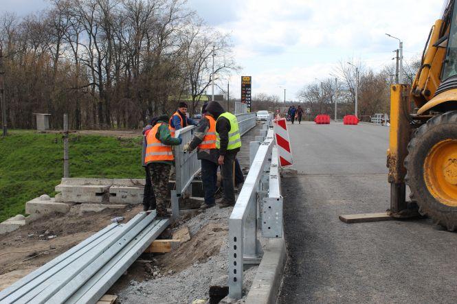 Білоцерківський міст відкриють для вантажного транспорту у четвер 29 квітня. Проїжджа частина до експлуатації готова, а з пішохідними переходами роботи ще багато. Поки в стояки відбійників дорожники поставили недостаючі болти і встановлюють для пішоходів бордюри.