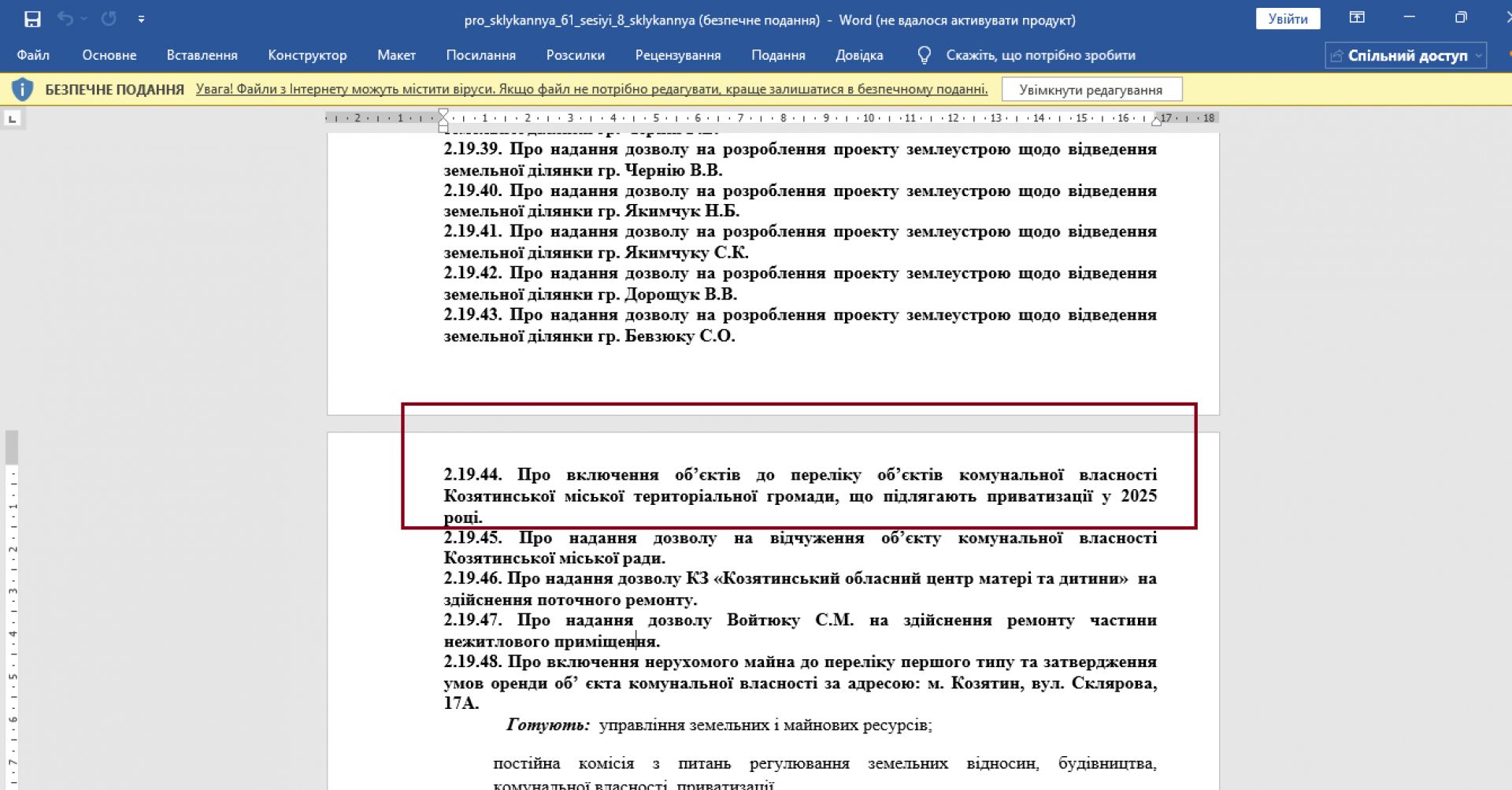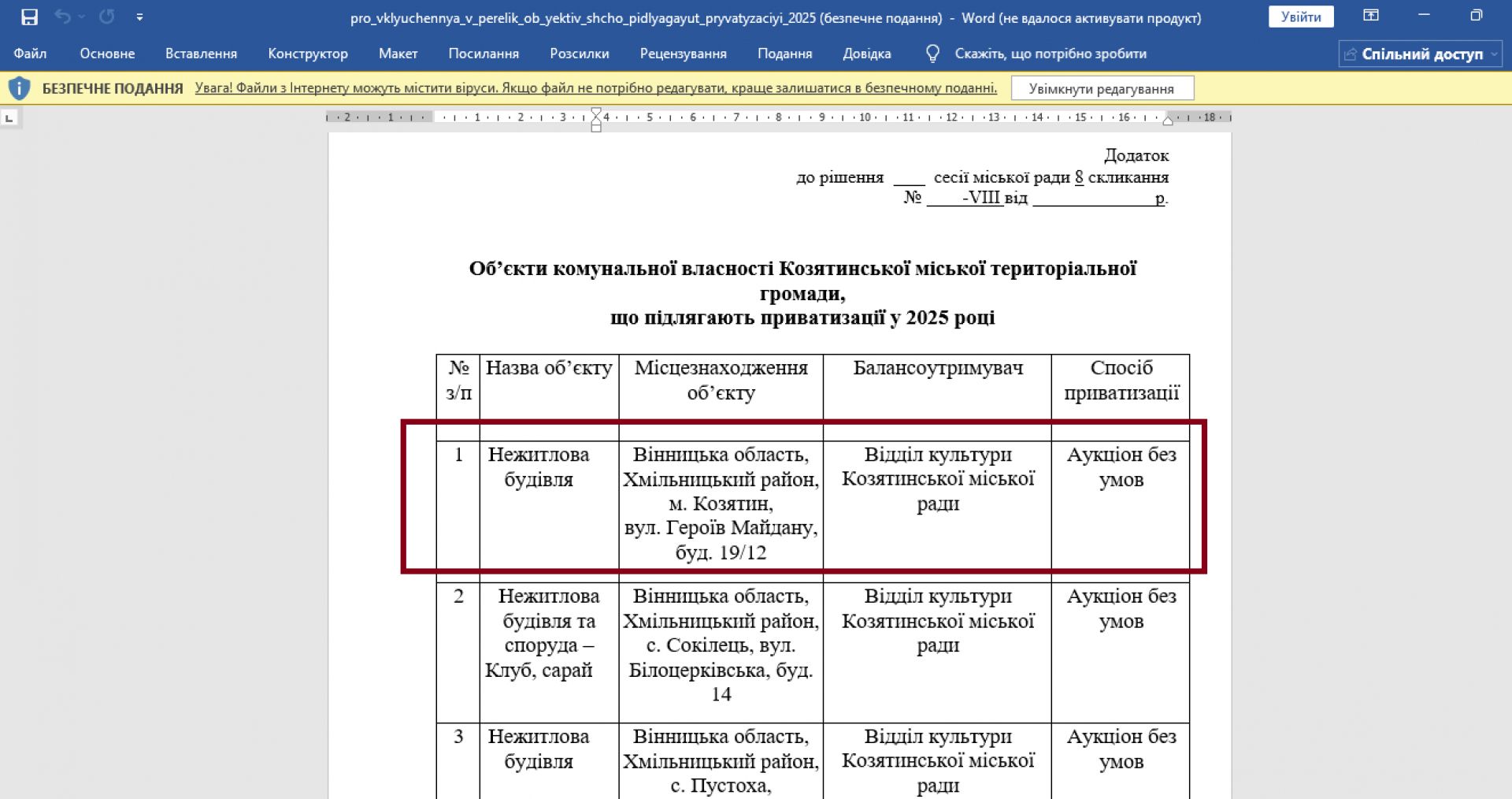 Серед питань порядку денного є включення об’єктів до переліку об’єктів комунальної власності Козятинської міської територіальної громади, що підлягають приватизації у 2025 році. У переліку цих об’єктів, згідно з додатком до проєкту рішення, нежитлова будівля на Героїв Майдану 19/12. Саме за цією адресою розташований колишній районний будинок культури.