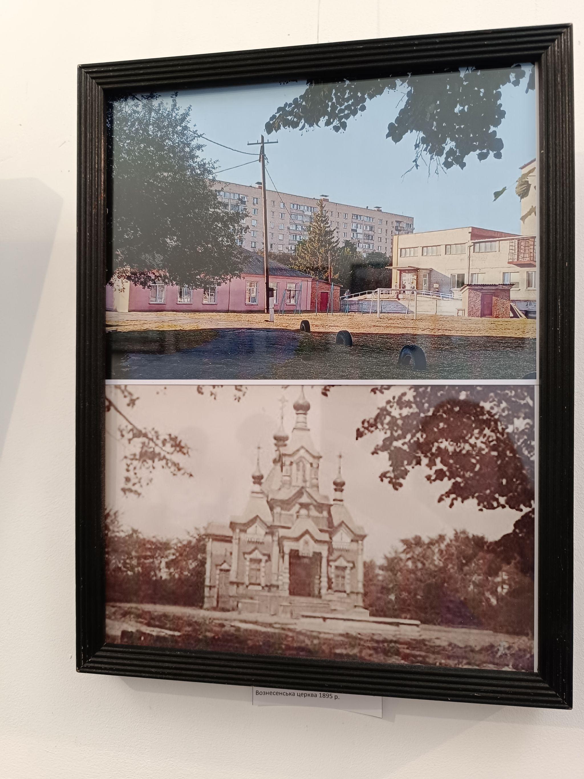 На цій же стіні — світлина Вознесенської церкви, яку знесли у 60-их роках минулого століття, щоб добудувати корпуси колишньої залізничної лікарні. Цим фото з Музеєм історії міста також поділився Дмитро Дахно. Перед храмом був фонтан, який видно на світлині. Тетяна, яка завітала на відкриття, погоджується — бабуся також розповідала їй, що перед церквою стояв водограй. Святиня розташовувалася зовсім поруч із сучасним ліцеєм №2. А поруч із церквами, як відомо, часто облаштовували цвинтарі.