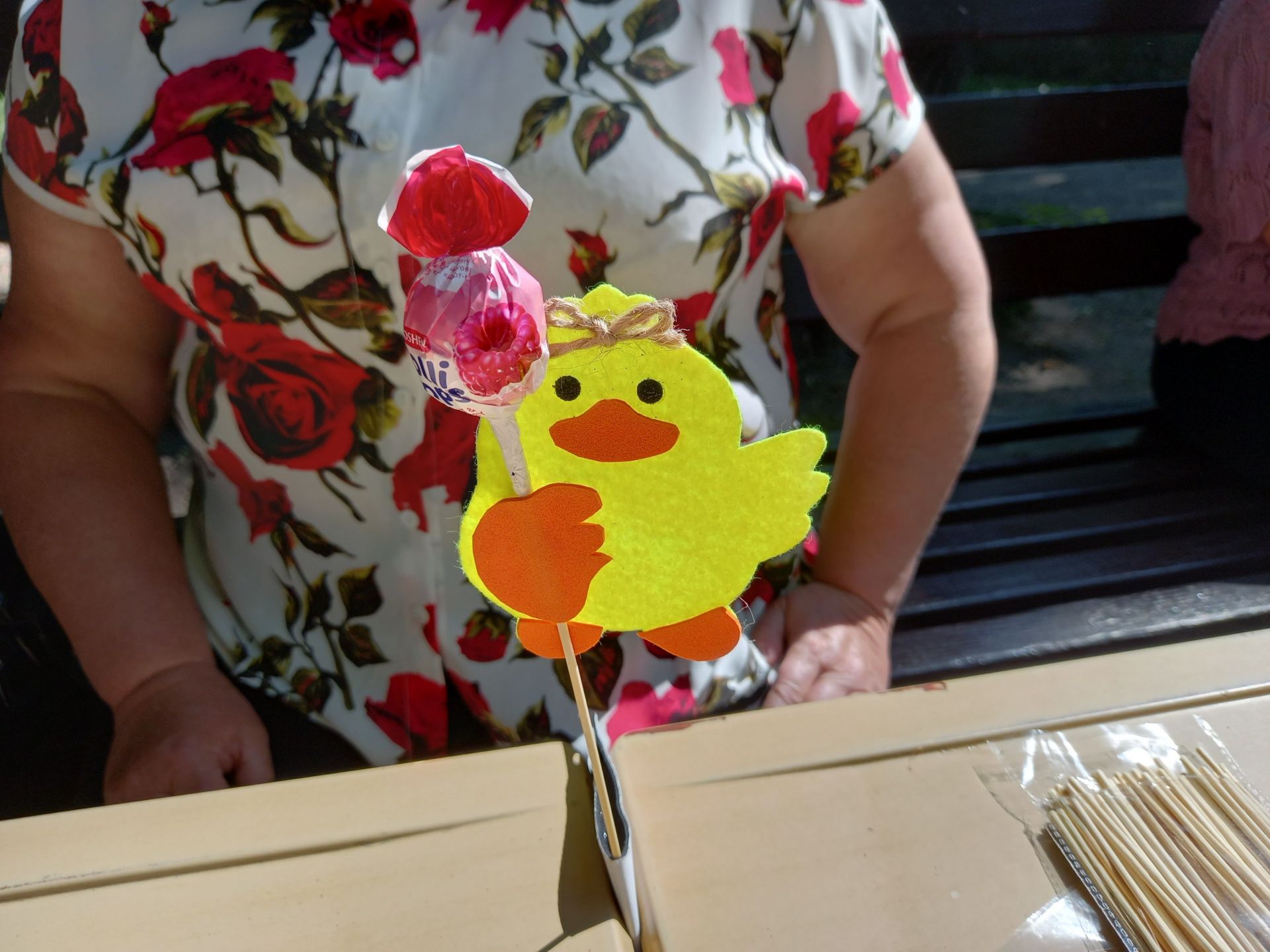 Усі, хто долучився до конкурсів, отримали солодкі подарунки — Чупа-Чупси. Але діти не їли цукерки одразу. Вони попрямували до майстерень під відкритим небом, де Анжеліка Іванцова та Світлана Гуменюк допомогли їм створити для цукерки декор із фетру та фоамірану. За декілька хвилин звичайні Чупа-Чупси перетворилися на Веселих каченят та Грайливих метеликів.