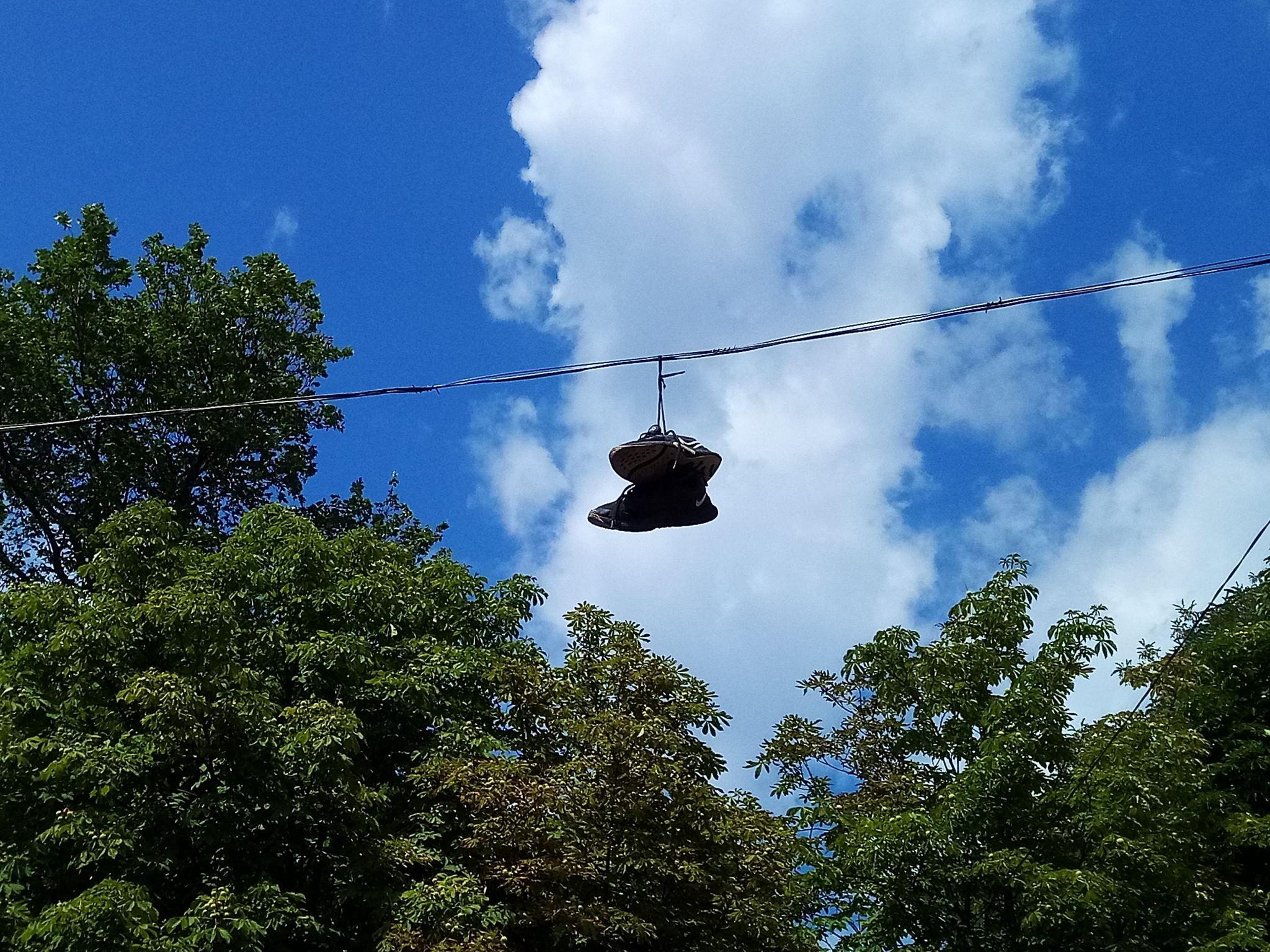 — Ось, йдіть, подивіться, кросівки висять, — показує Світлана. На дроті, натягнутому між двома будинками гойдається пара спортивного взуття, зв’язана між собою шнурками. — Ми загуглили, подивилися, чому вішають кросівки.