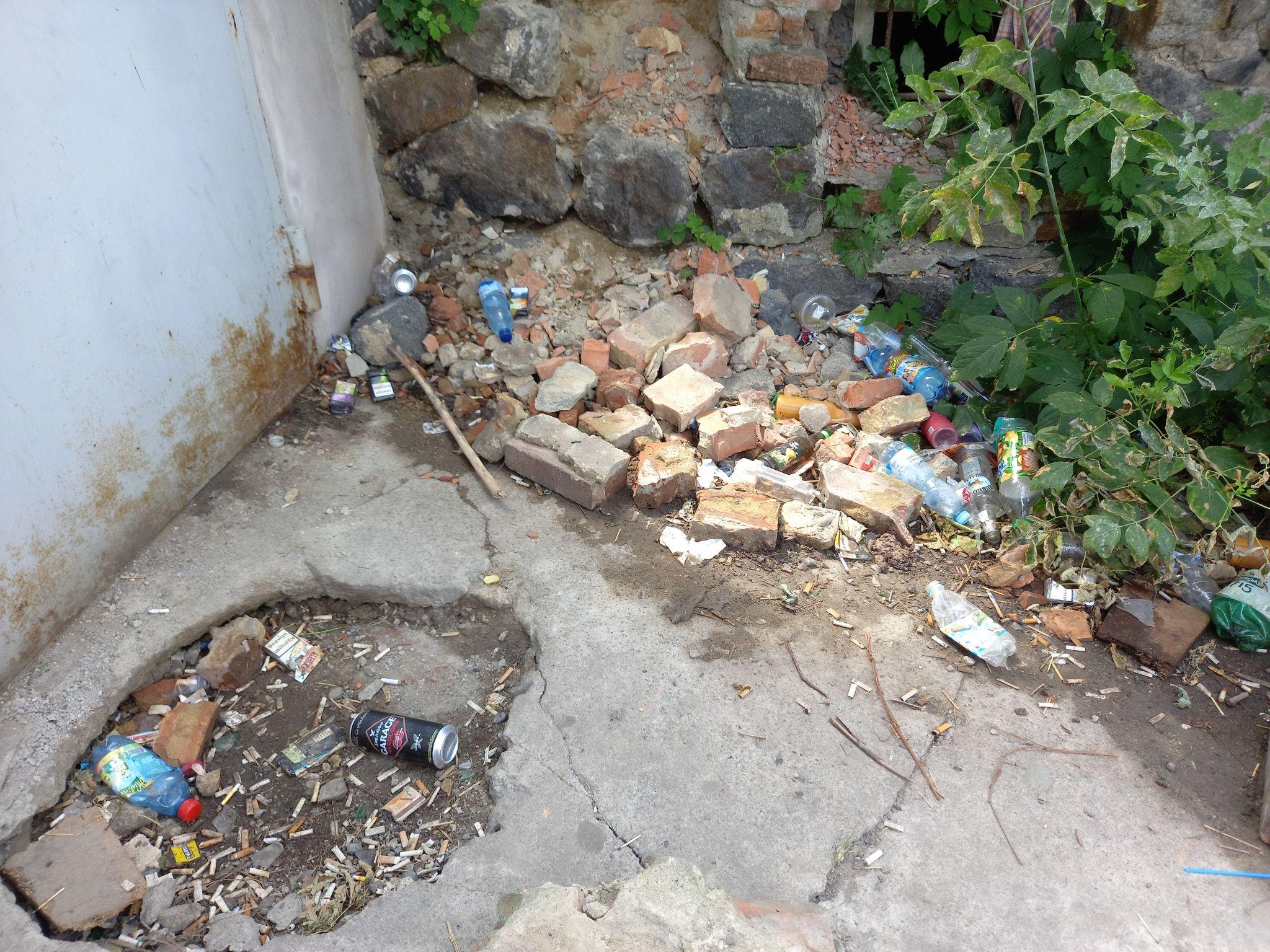 Йдемо за Світланою до того місця, де в їхньому дворі молодь влаштовує посиденьки. Там купа битої цегли, скрізь пляшки від газованки і значно міцніших напоїв, навіть сорокаградусних. Асфальт рясно встелений недопалками і пустими пачками з-під цигарок. Тхне сечею.