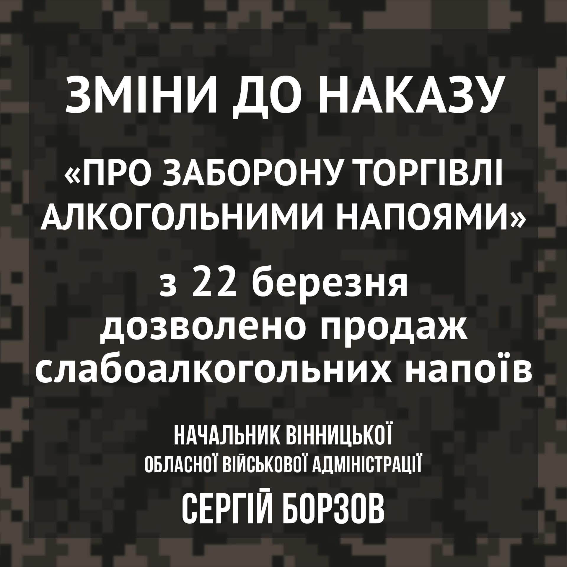 Додамо, що вінницька військова обласна адміністрація дала дозвіл із 22 березня продажу слабоалкогольних напоїв.
