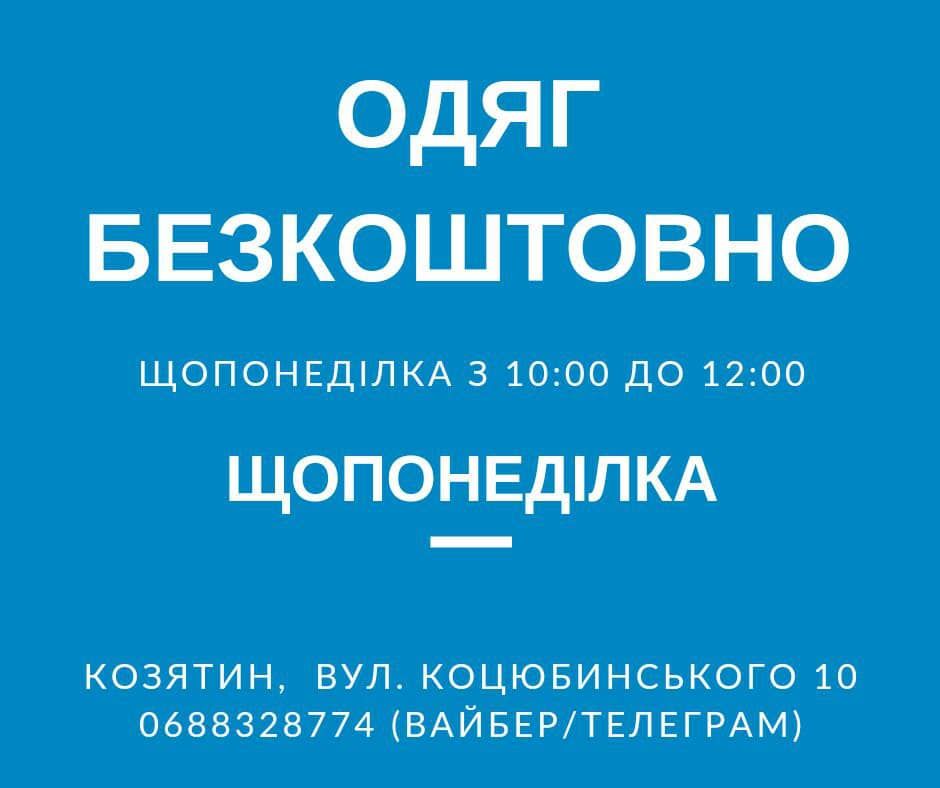 Одяг роздаватиму щопонеділка з 10:00 до 12:00. Молитовний будинок церкви християн Адвентистів сьомого дня. Козятин, вул. Коцюбинського 10. (р-н «Білої казарми»)