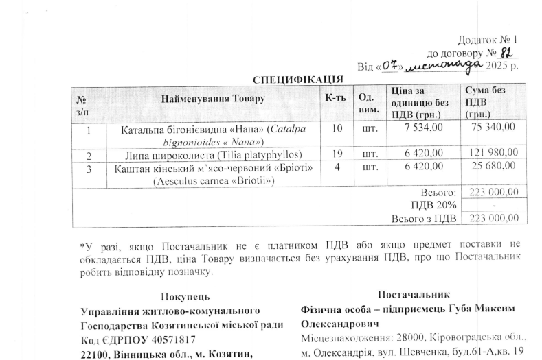 Вартість угоди — 223 тисячі гривень. Відповідно до умов договору, найдорожче коштували саджанці катальпи — 7 534 гривні за кожен. Саджанці каштану та липи в одній ціні — 6 420 гривень за кожен.