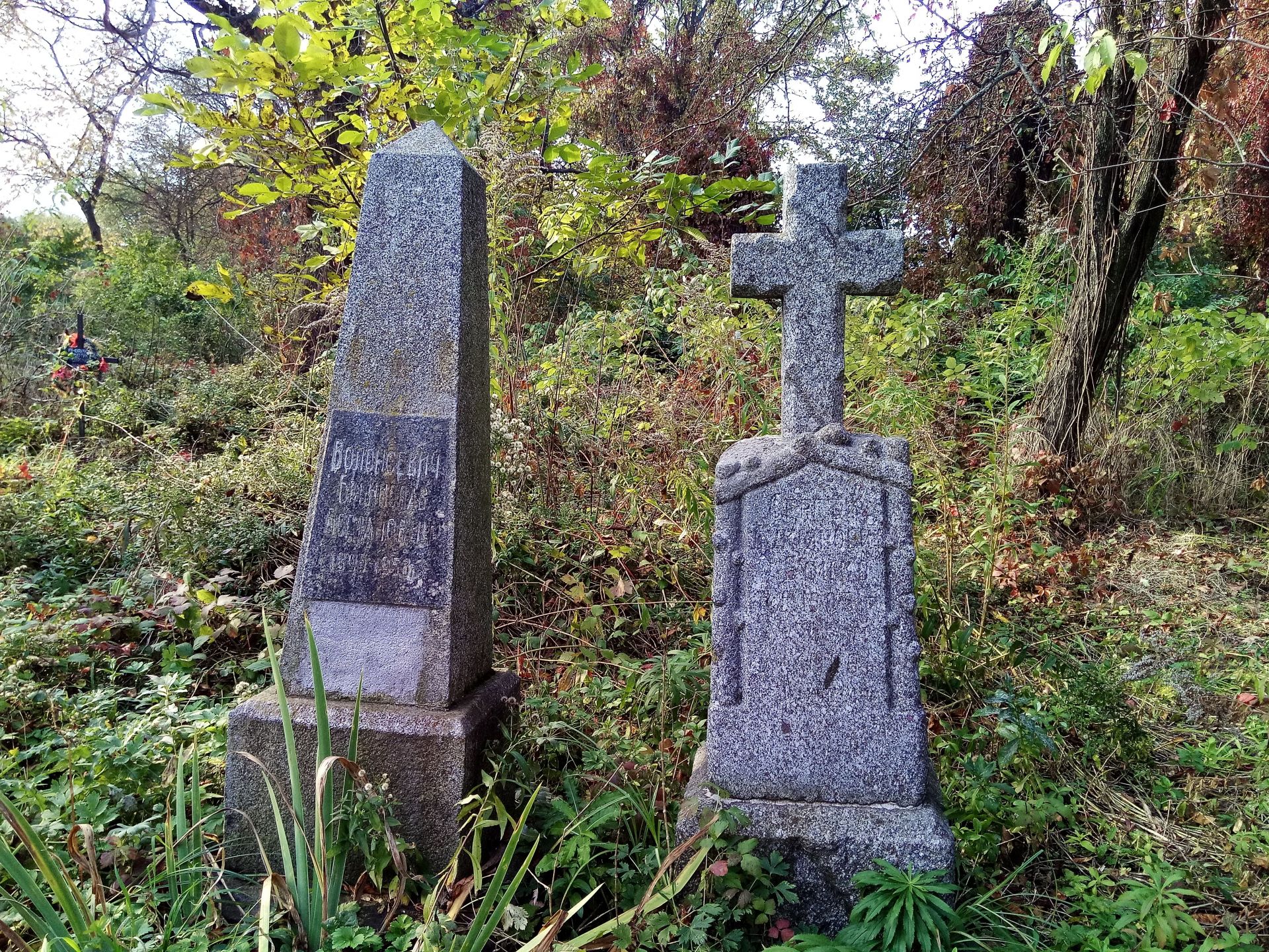 Тут чимало пам’ятників у формі пнеподібних кам’яних хрестів. Це округлий хрест на п’єдесталі і на перший погляд здається, що він збитий з двох дерев’яних колод. Якого року ці поховання — встановити не вдалося. Більшість таких пам’ятників поросли чагарниками настільки, що видніються лише вершечки.