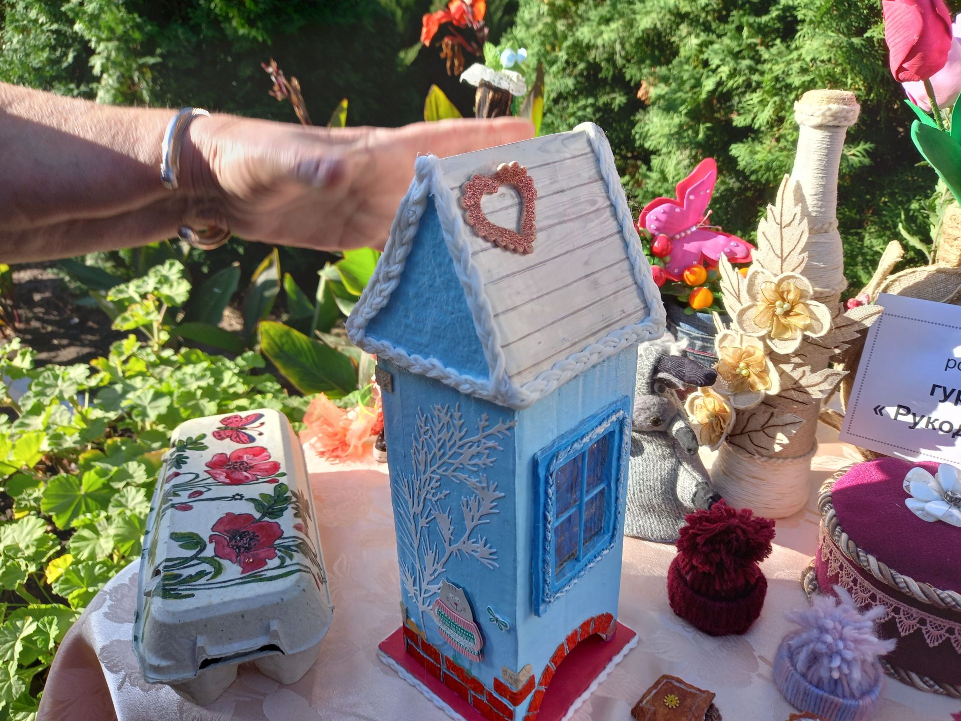 — Це була шкатулка зі звичайного картону, — показує Лариса. — Я взяла і, як кажуть зліпила з того, що було. Це ми шапочки в’язали, вони взимку були в тренді. Джинсових поробок у нас багато. Позавчора я доробляла цю чайну хатинку. Внизу дістаєш чайні пакетики, а збоку справжні двері і навіть киця сидить. Мене чоловік питає: «Ти спати лягаєш?» Я кажу: «Лягаю». Але я б до ранку робила.