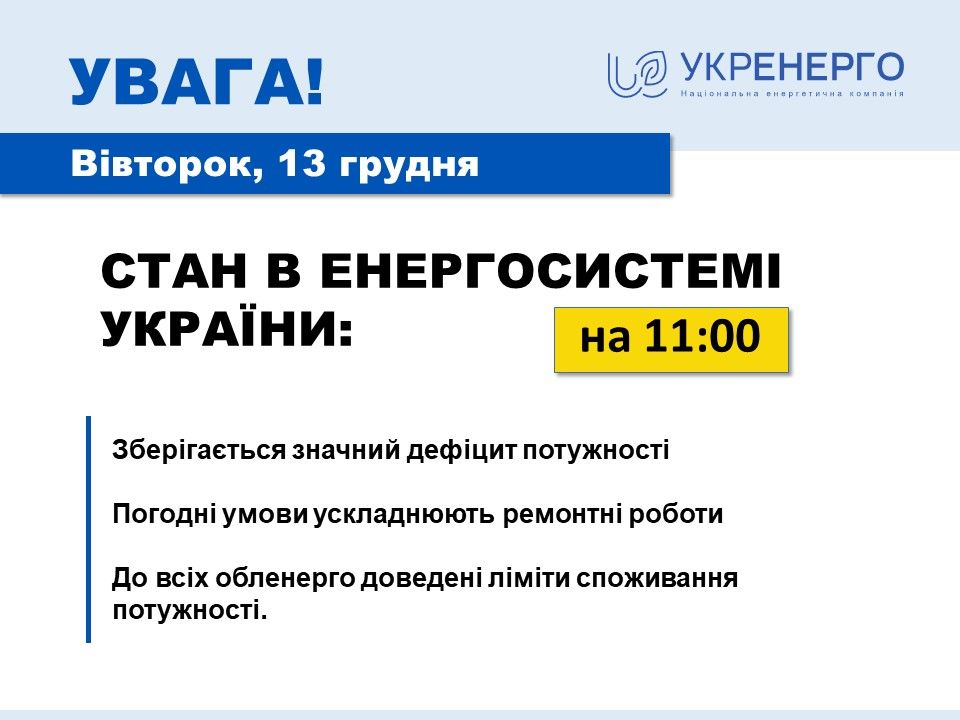— Станом на 13 грудня в енергосистемі зберігається складна ситуація. Дефіцит електроенергії залишається значним. Всім обленерго доведені ліміти споживання електроенергії. Для отримання точної інформації по окремому регіону рекомендуємо стежити за повідомленнями операторів системи розподілу (обленерго). — йдеться у повідомленні