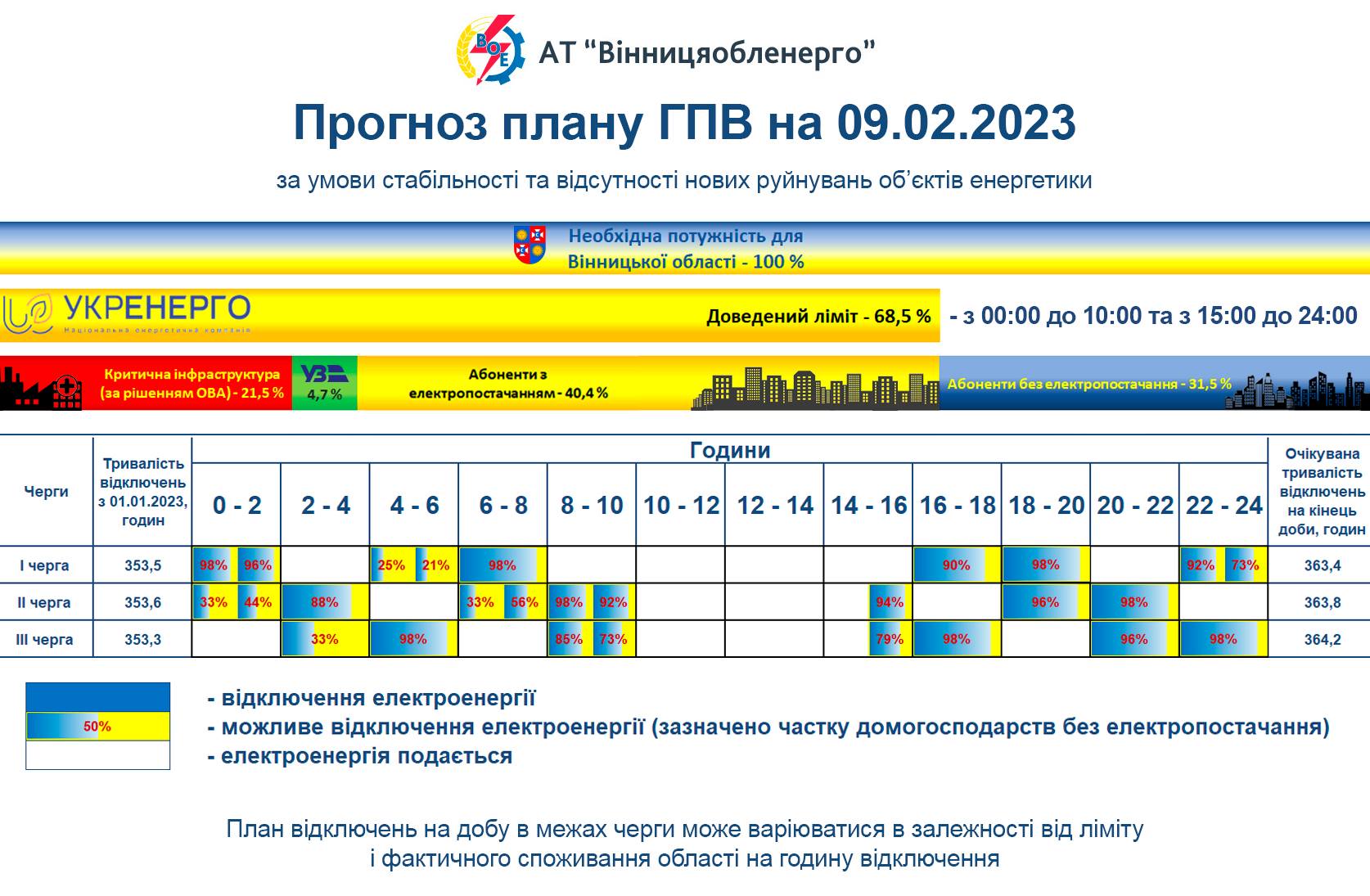 — Відповідно до доведених лімітів Укренерго на 09.02.23 р. з 00:00 до 10:00 та з 15:00 до 24:00 по Вінницькій області задіяли обмеження електропостачання відповідно до графіка погодинного відключення, — йдеться у Вінницяобленерго