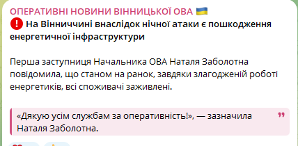 — Від НЕК «Укренерго» отримали завдання про застосування Графіків погодинних відключень електроенергії для Вінницької області, — йшлося у вечірньому повідомленні