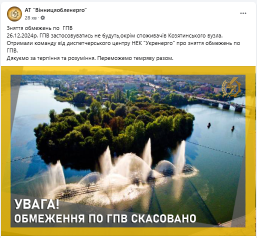 — Графіки погодинних відключень 26 грудня застосовуватись не будуть, окрім споживачів Козятинського вузла, — написали у Вінницяобленерго