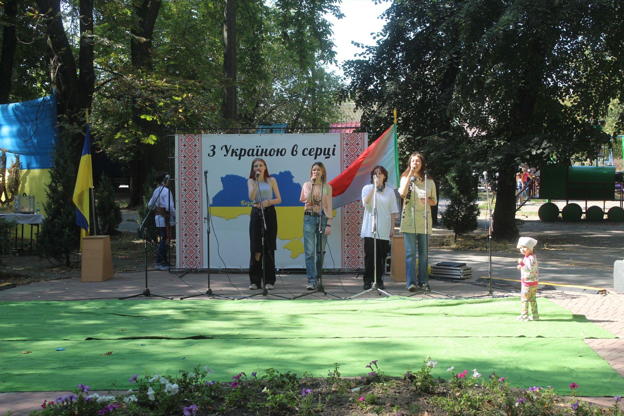 На перехресті двох алей була облаштована сцена для співочих і танцювальних колективів. Поруч зі сценою — символи України: державний прапор та Герб України.