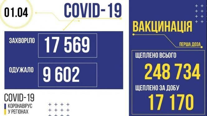 Станом на ранок 1 квітня в Україні виявили +17 569 нових випадків коронавірусної хвороби COVID-19. Зокрема, захворіли 813 дітей та 486 медпрацівників.