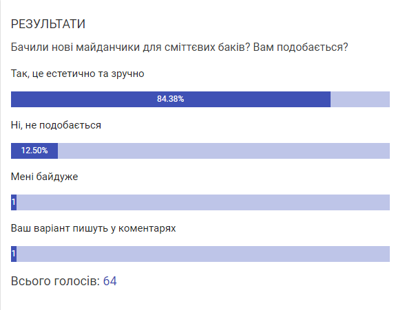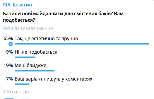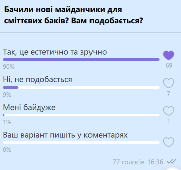 Публікація про нові майданчики для сміттєвих баків набрала чимало коментарів. Люди жваво обговорювали цю тему. Більшість цікавила ціна питання та зручності під’їзду спецтехніки, яка забиратиме сміття. Коментарі публікуємо далі по тексту без змін. Робили ми і опитування. А саме запитували і на нашому сайті koziatyn.info і у наших пабліках у соцмережах, чи подобаються козятинчанам нові майданчики. Понад 84% читачів, які проголосували, вважають, що це естетично та зручно. Понад 13% такі майданчики не подобаються.