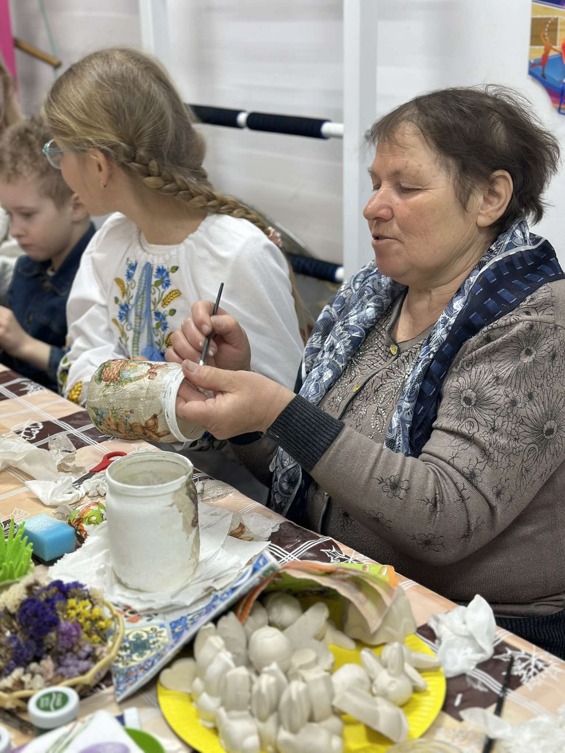 Діти разом із батьками натхненно працювали над створенням великодніх виробів, отримуючи не лише практичні навички, а й щирі емоції радості та спілкування. За допомогою серветок, сухоцвітів та мережива вони декорували банки, перетворивши їх на красиві вази.