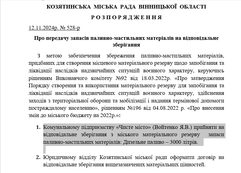 Про те, що ще тиждень тому саме Ярослав Войтенко був директором «Чистого міста» свідчить і документ, який ми знайшли на сайті Козятинської міської ради. Минулого тижня, а саме у вівторок, 12 листопада виконуюча обов’язки міського голови, секретар Козятинської міської ради Ірина Репало видала розпорядження, відповідно до якого комунальному підприємству «Чисте місто» передали на зберігання з міського матеріального резерву запаси паливно-мастильних матеріалів: 3 тисячі літрів дизпалива. У документі вказано прізвище Войтенко Я. В.