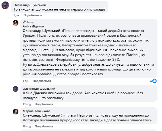 — Пиковецька і Флоріанівська гімназії, а також ЗДО № 5 уже підключили до газопостачання і тепло для дітей уже «заходить» в приміщення цих закладів. У ЗДО № 3 саме в ці хвилини (17 жовтня 10:11) — прим. авт), проходять роботи по підключенню до газопостачання. Залишається ще один заклад — Ліцей #7, котрий (я сподіваюся) буде підключено у найближчий час, — написала у себе на сторінці Аліна Діденко.