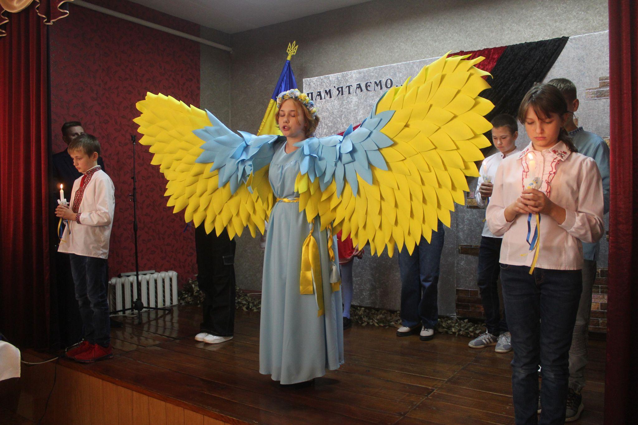 - На початку заходу під Гімн Небесної сотні, тримаючи в руках свічки пам’яті, на сцену актової зали виходять учні гімназії, а дівчина в образі птаха читає вірш.