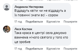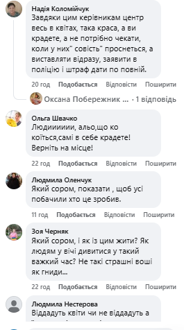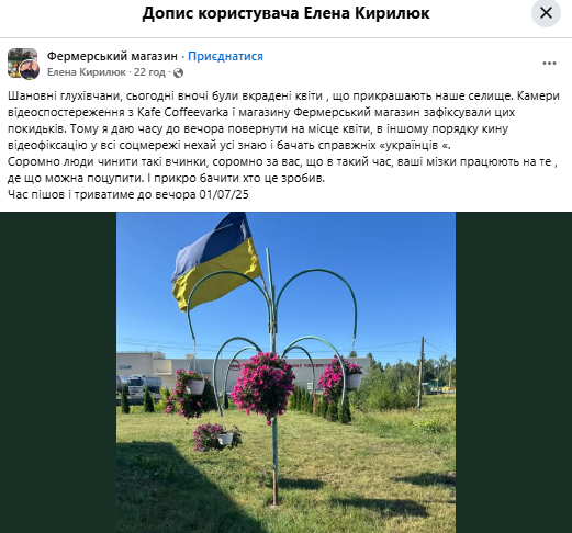 — Шановні глухівчани, сьогодні вночі (1 липня) вкрали квіти, що прикрашають наше селище. Камери відеоспостереження з Kafe Coffeevarka і магазину Фермерський магазин зафіксували цих покидьків. Тому я даю часу до вечора повернути на місце квіти, в іншому порядку кину відеофіксацію у всі соцмережі нехай усі знаю і бачать справжніх «українців», — пише Олена Кирилюк