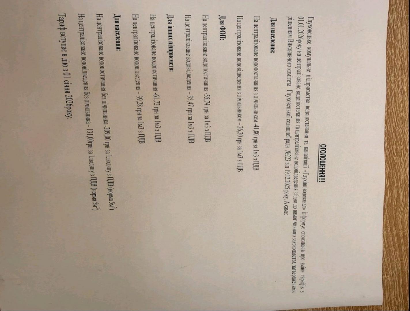 - Днями Глуховецький водоканал повідомив про підвищення тарифів на централізоване водопостачання та водовідведення
