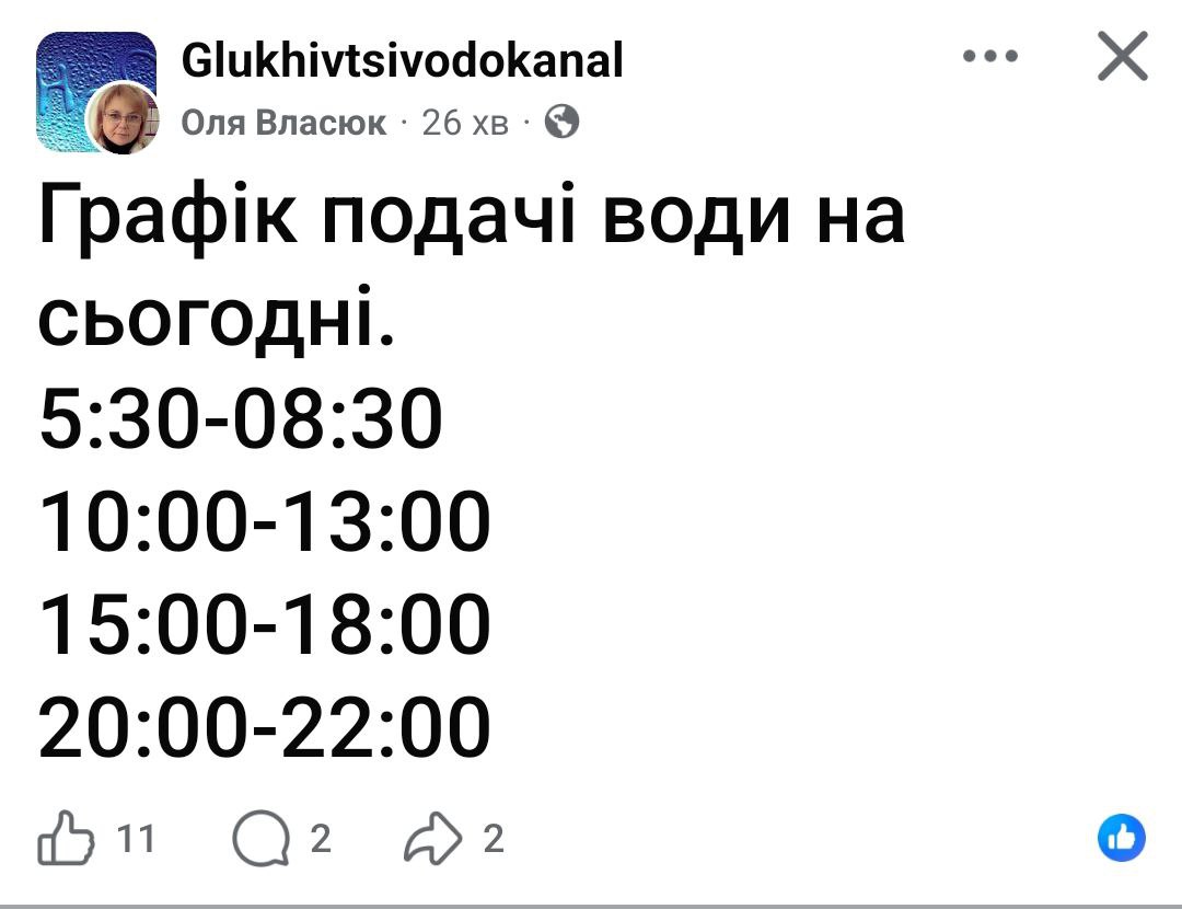 «Шановні абоненти КП Глухівціводоканал В звʼязку із аварією на лінії електропередач,водопостачання буде відновлене на протязі дня, просимо вибачення за тимчасові незручності» — йдеться у повідомленні