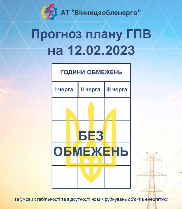 На сьогодні, 12 лютого, «Укренерго» не задіяло обмеження електропостачання для Вінницької області. Саме тому поточної доби ми будемо зі світлом в оселях.