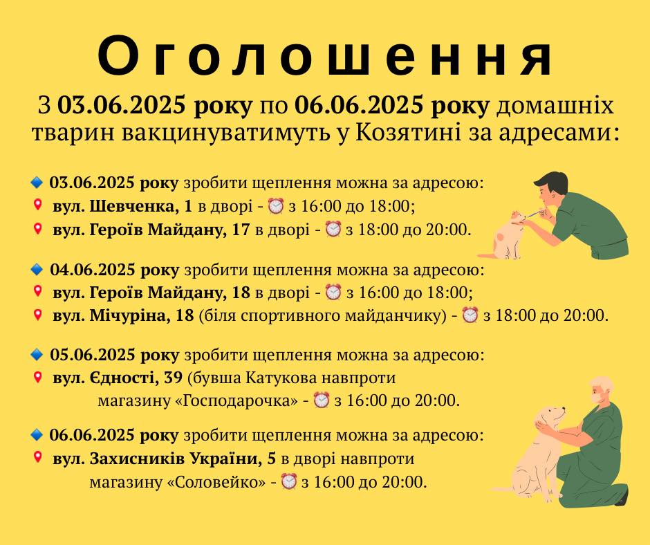 - У червні фахівці Козятинського відділу Хмільницької районної державної лікарні ветеринарної медицини будуть проводити щорічну кампанію з профілактичних щеплень проти сказу домашніх улюбленців на території Козятина.
