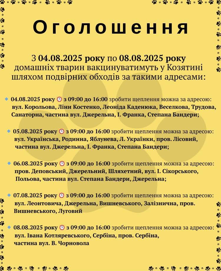 - Фахівці Козятинського відділу Хмільницької районної державної лікарні ветеринарної медицини будуть проводити щорічну кампанію з профілактичних щеплень проти сказу домашніх улюбленців на території міста Козятин.