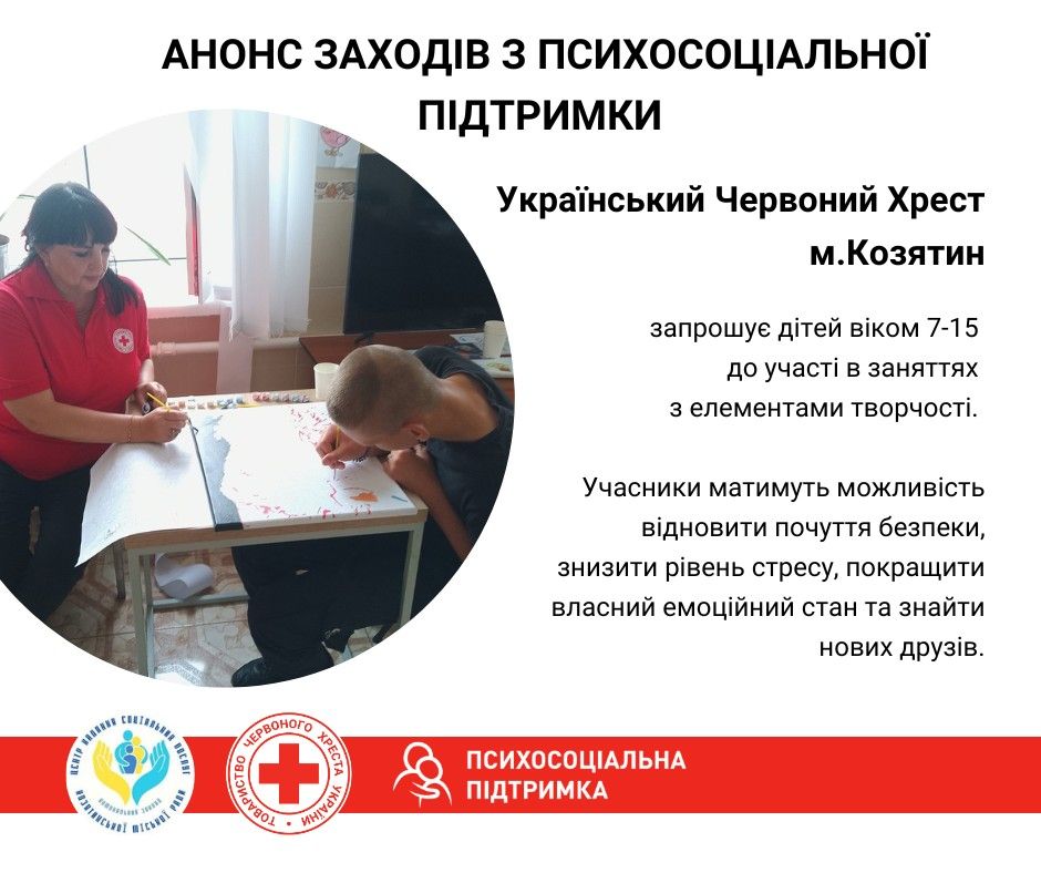 - Запрошують дітей Козятинської громади віком 7-15 років до участі в заняттях з психо-соціальної підтримки з елементами творчості. Також відбудеться майстер-клас з виготовлення мотанки. Локація — приміщення «Центру надання соціальних послуг»