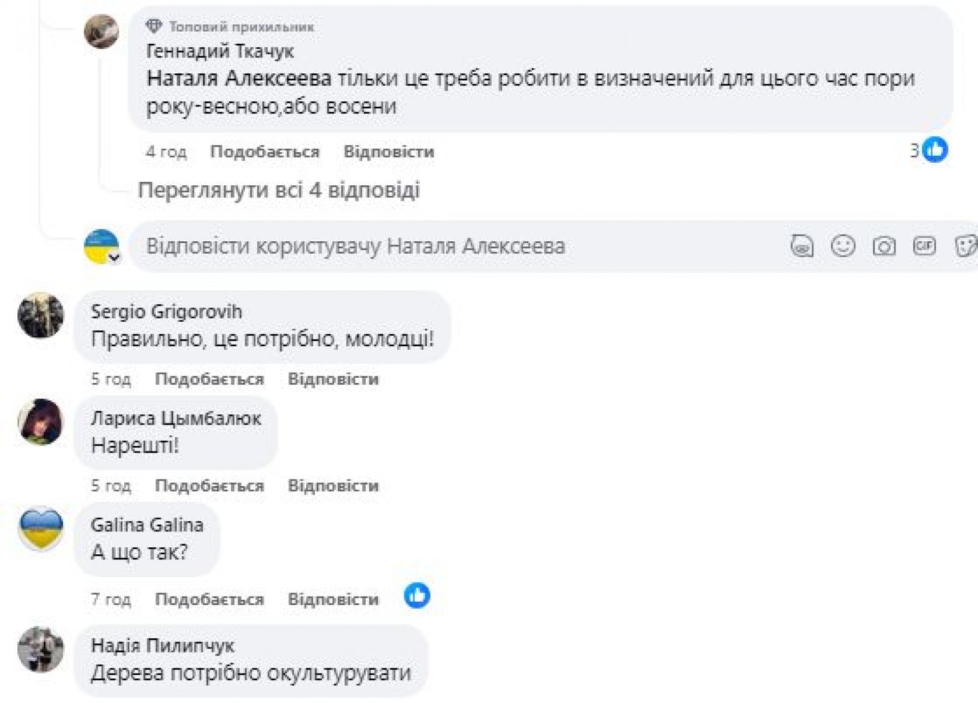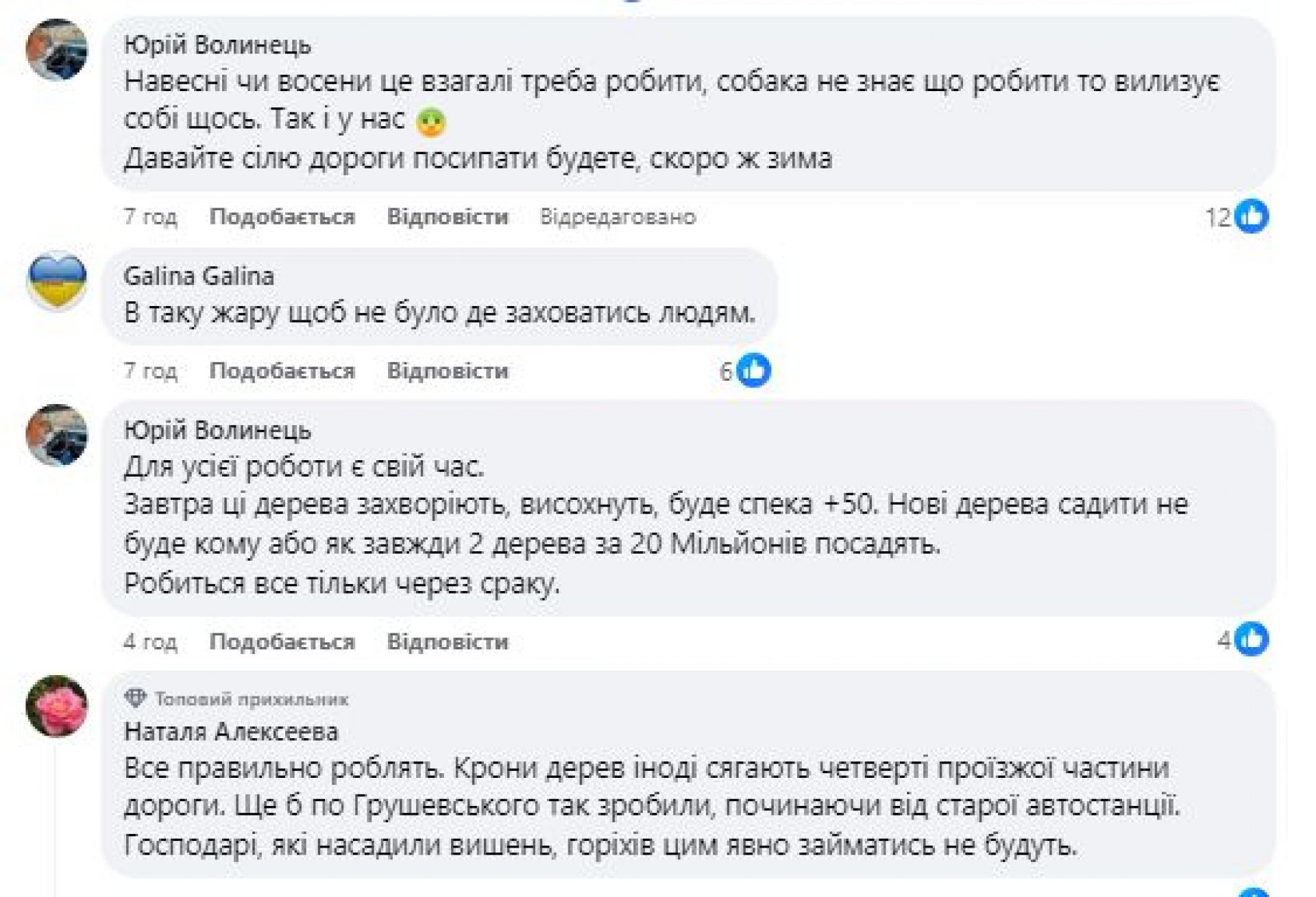 - Під відеороликом, думки козятинців з цього приводу розділились. Одні коментують — такі роботи (формування крон) потрібно робити навесні чи восени, але ніяк не тоді, коли на вулиці спекотне літо.