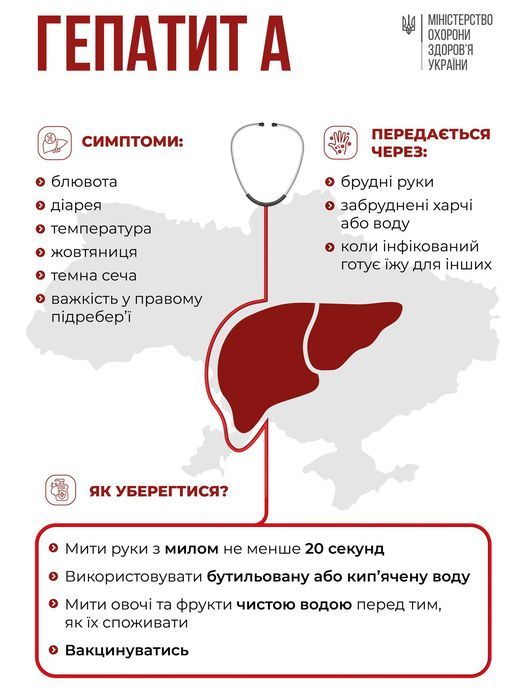 У Міністерстві охорони здоров'я України нагадують: симптоми гепатиту А можуть включати жовтяницю, головний біль, слабкість, діарею та нудоту.