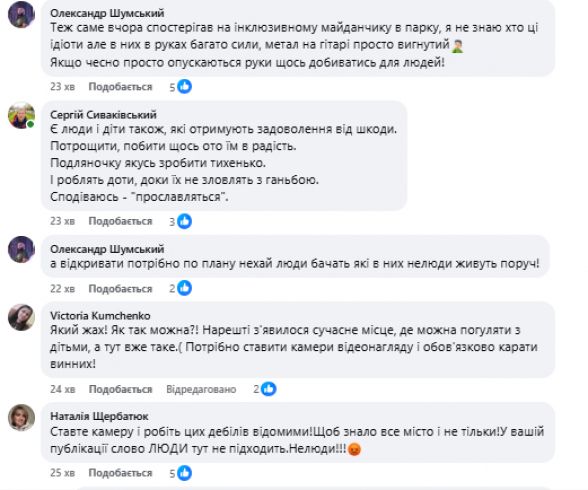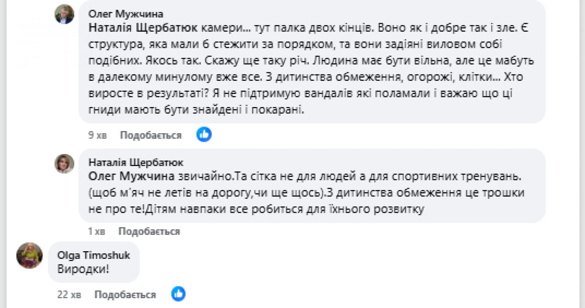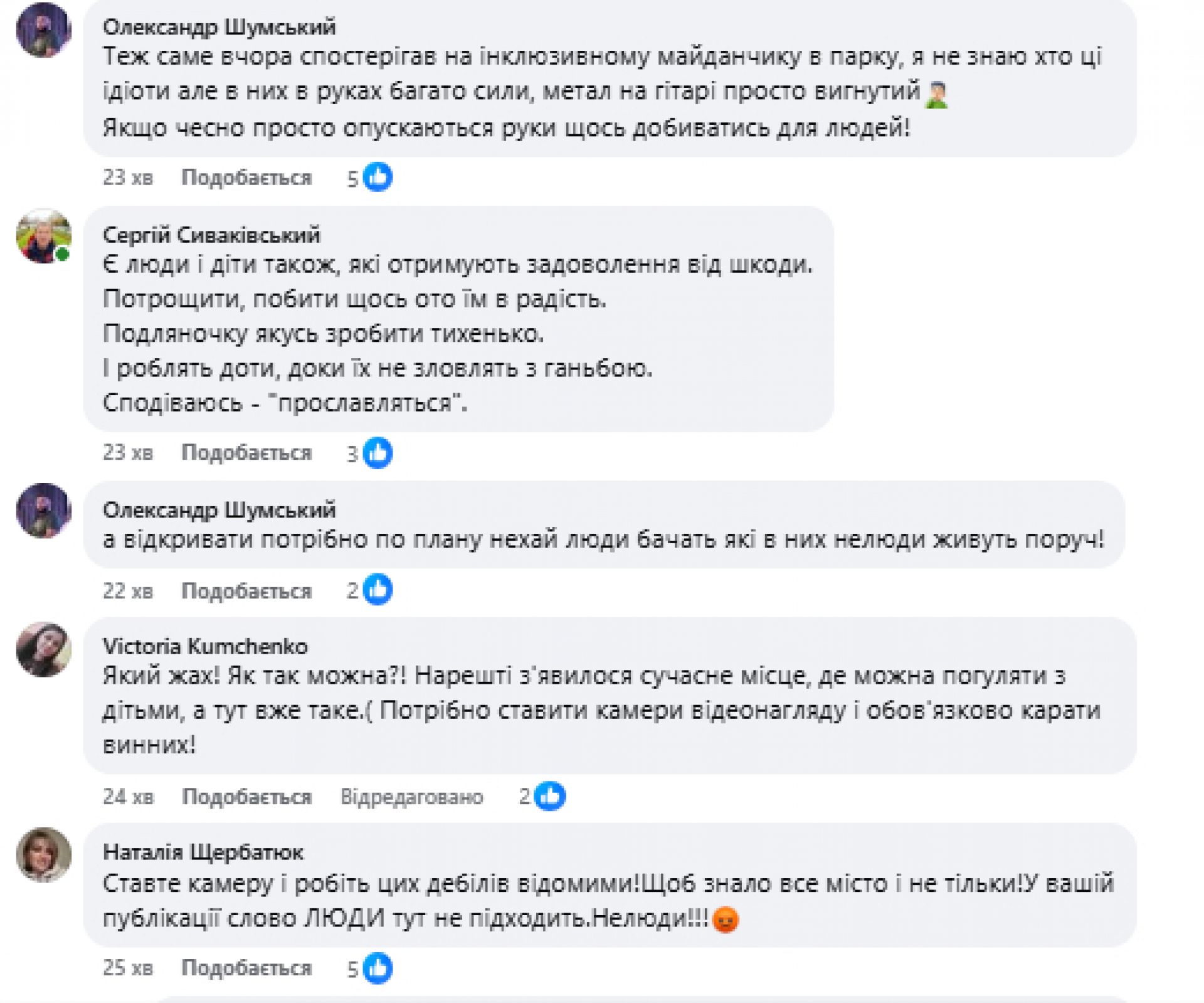 — Чи є межа людської підлості, зухвалості і нахабству? Адже тільки кілька днів тому активно обговорювали в соц мережах відкриття цього майданчика для дітей, що по вул. Єдності, а сьогодні ми бачимо таку «картину маслом». Замок на майданчик зламаний, ручка на вхідній секції виламана, частина огорожі вирвана… — написала Аліна Діденко, начальник Департаменту гуманітарної політики Козятинської міської ради.